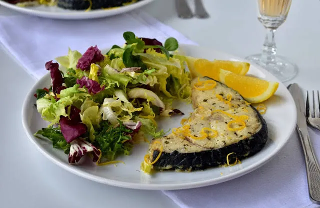 Настържете отгоре лимонова кора и сервирайте със свежата салата и чаша бяло вино.
