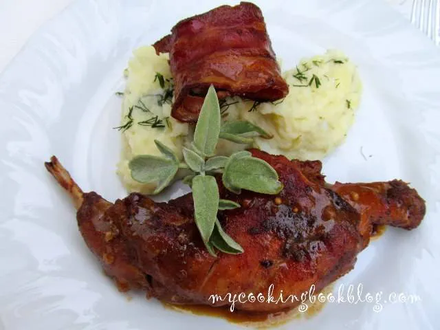 Ароматно заешко печено в плик и картофено пюре с кисели краставички и копър