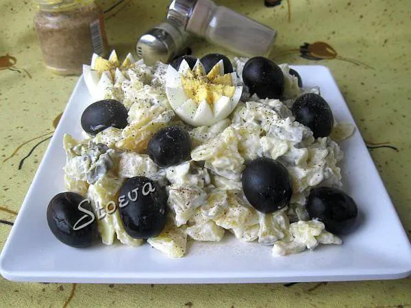 Зимна салата. Първо си казах че то почти руска салата", но не - комбинацията на майонеза с мляко я прави по-лека, а вкуса на чесъна - и по-различна.