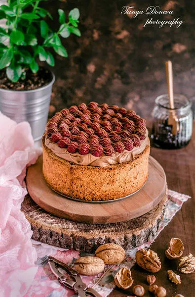 Бадемово-лешников сладкиш с шоколадов мус и малини