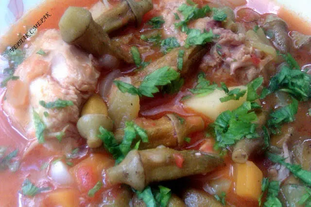 Вкусна яхния с пиле, бамя и още зеленчуци от градината
