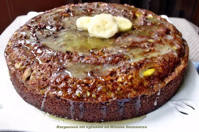 Бананов кейк с шоколад, шамфъстък и медена глазура