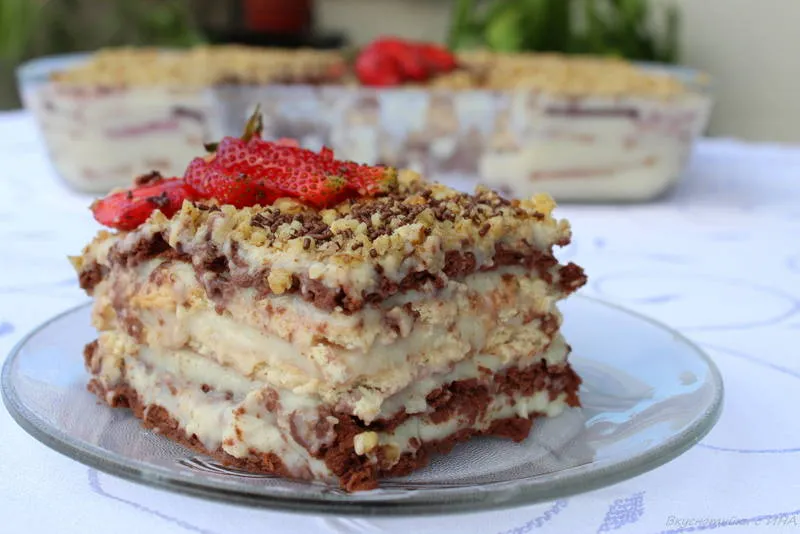 Тази бисквитената торта е пухкава и сочна, като сладостта в нея е нито много, нито малко - балансирана на сладост