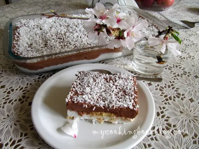 Тази бисквитена торта е изключително лека! Основата и е от чаени бисквити, кремът е варен и се приготвя от кокосово мляко, вода, захар, нишесте и розова вода.