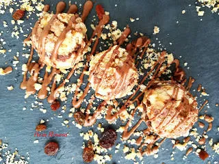 За по-голям ефект сервираме тортата на топки с помощта на лъжица за сладолед. Или нарежете на квадратни парчета. По желание поливаме с разтопен шоколад и поръсваме със смлени орехи.