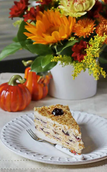 Бисквитена торта с маскарпоне и сладко от боровинки
