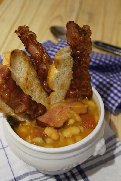 Боб с пушени ребърца, пържен бекон и печени филийки