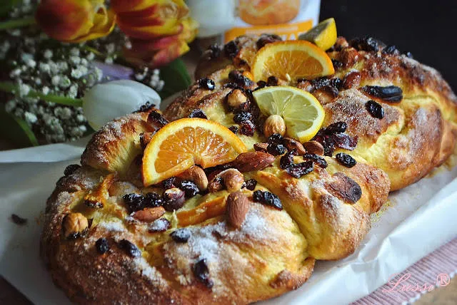 Много богат козунак, който да има обилна украса от ядки, сушени плодове и захар, но да не са в него, за да не ми пречи плънката на конците.