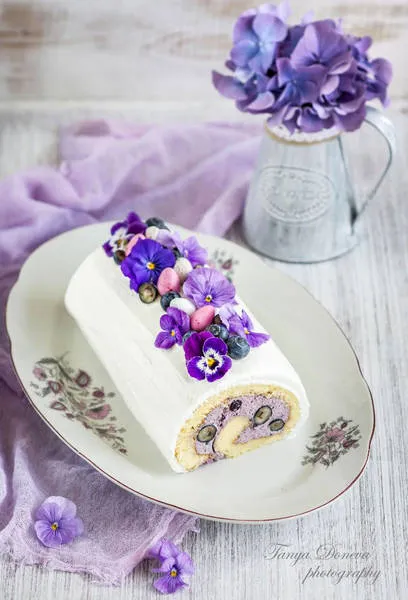 След както рулото е готово, шпакловайте го със заделения крем от маскарпоне и сметана и декорирайте с пресни боровинки и свежи теменужки.