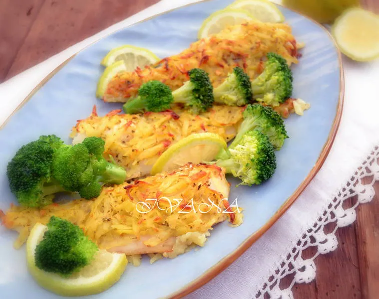 Лека и здравословна вечеря с бяла риба печена на фурна в хрупкава картофена коричка