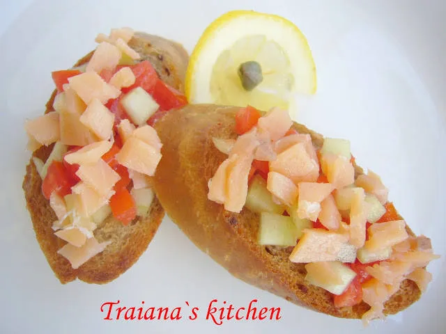 Брускети с пушена сьомга, каперси и салца