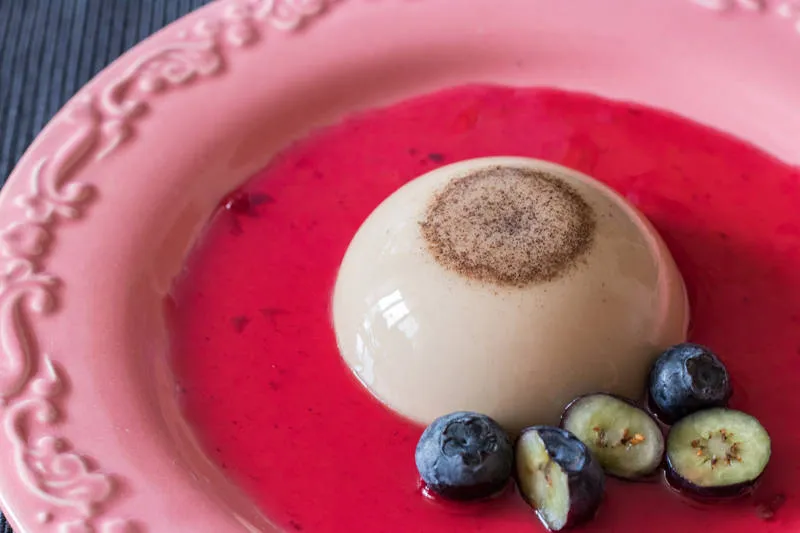 За сервирането затопляме леко сладкото и го изсипваме в чинийка с помощта на супена лъжица. Слагаме панакотата и декорираме по избор със сезонни плодове.