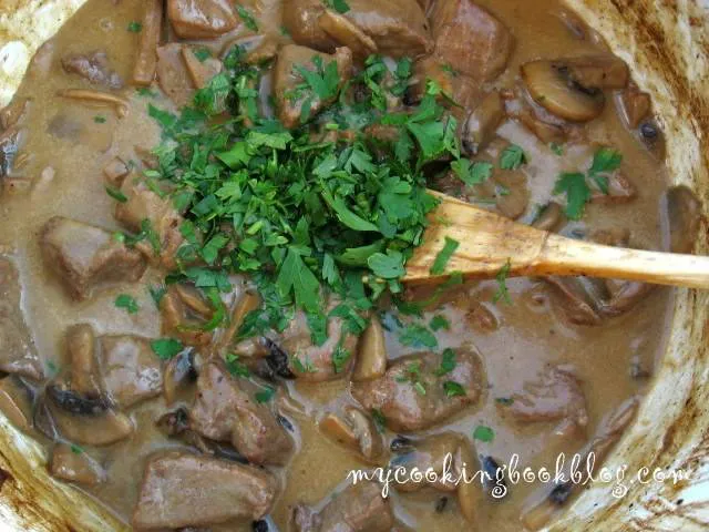 Beef stroganoff - в най-простия си вариант представлява крехко телешко месо със сос от гъби и заквасена сметана. Сервира се с гарнитура от сварен ориз или макаронени изделия, а лично на мен много ми харесва и със сварени картофи