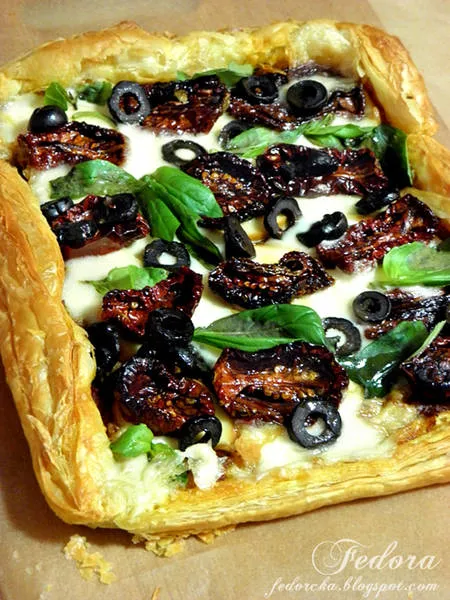 Бърза тарта или пица със сушени домати, маслини и сирена