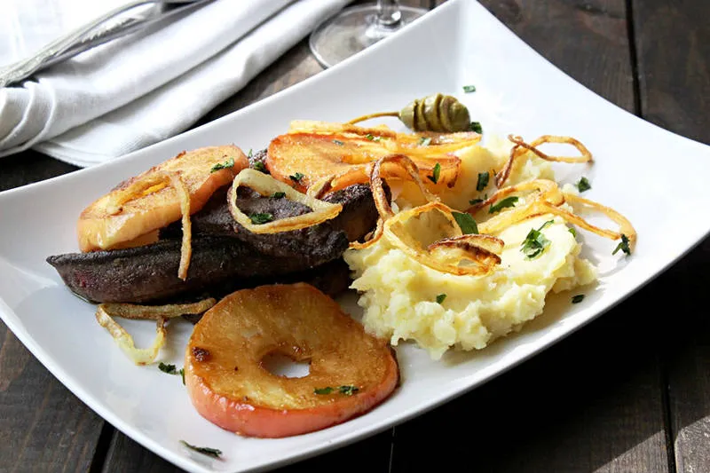 Гурме по немски. Сервиране: В чиния се подреждат парчета дроб, гарнират се с ябълковите и лучени кръгчета и картофено пюре. Ястието се поръсва магданоз