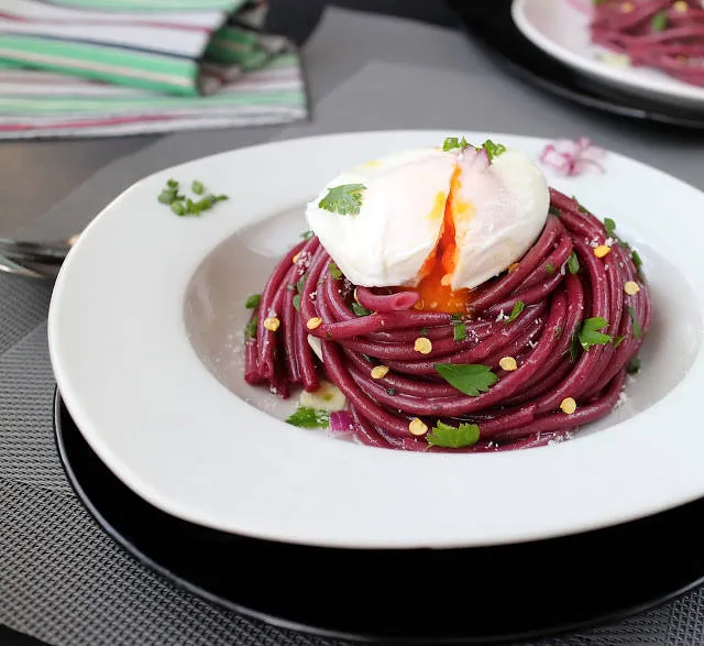 Тези букатини /bucatini - по-дебели спагети с отвор (buco)/ са варени в червено вино и задушени в зехтин с чеснов винен сос, и гарнирани отгоре с меко поширано /забулено/ яйце