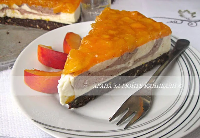 Ефектен при разрез и очакващо вкусен :) летен сладкиш с пресни праскови.
