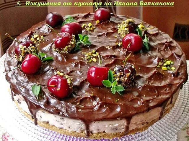 Чийзкейк с череши, шам фъстък и шоколадова глазура