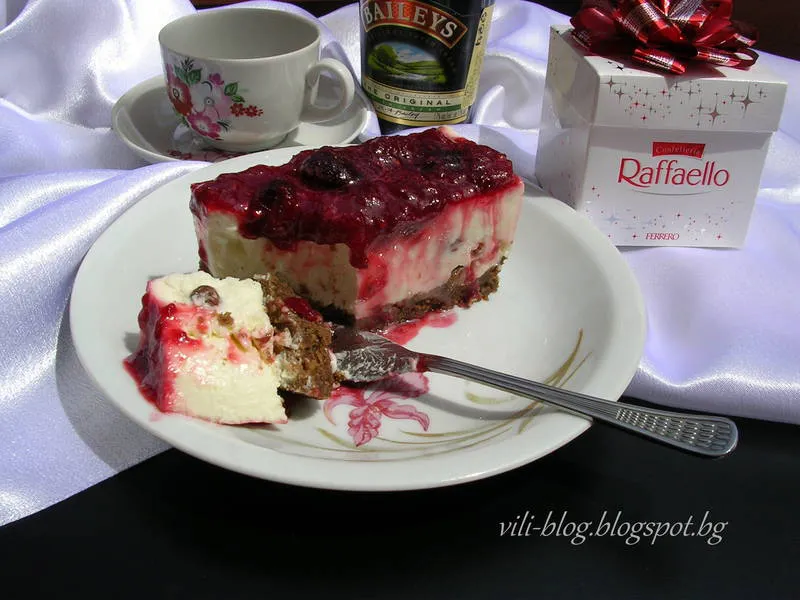 Чийзкейк с ягоди, череши и стафиди