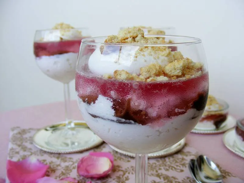 Когато цъфтят розите така ухаят и става ароматно и в кухнята. В два варианта: с бисквитки и без бисквитки. Единият вариант като чийзкейк с желиран сироп от рози и шоколад с рози, а втория вариант е само кремчето с желе.