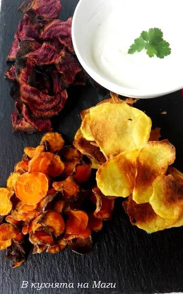 Чипс от тънко нарязани зеленчуци и изпечени във фурната - поднесете с млечно майонезен сос