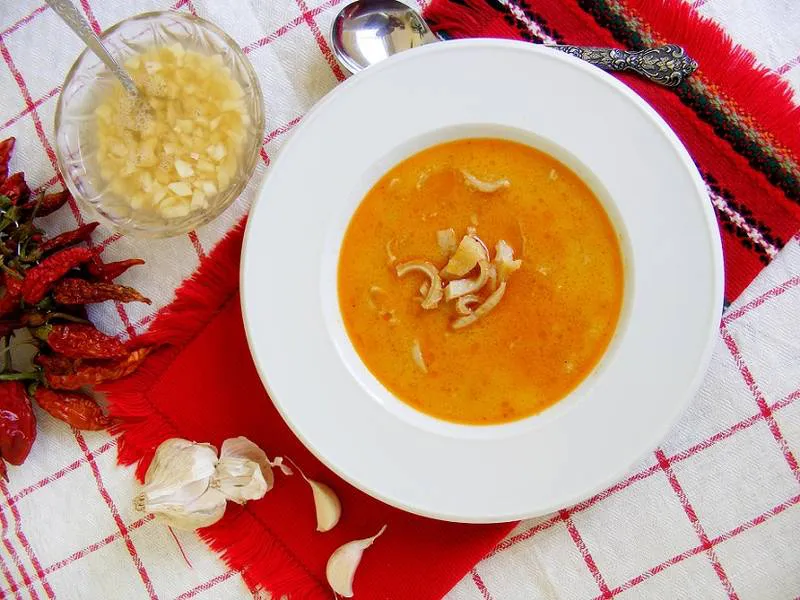 Чорбата се сервира със счукан чесън с оцет, с люти чушки, с кой каквото обича.