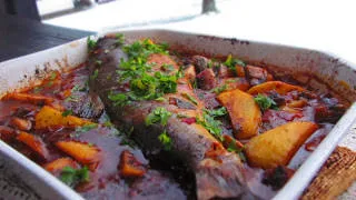 Цяла риба (в случая е Дива сьомга) със зеленчуци, на фурна и по стара българска рецепта