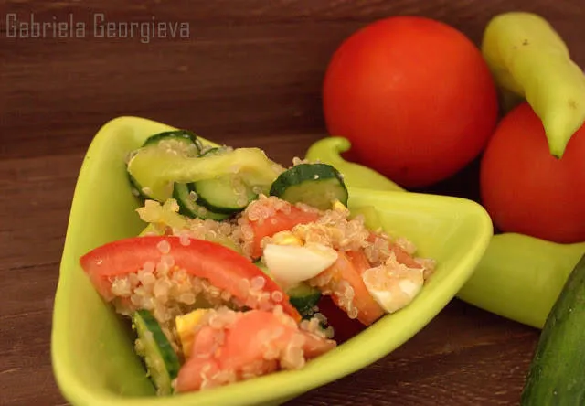 Докато все още се намират вкусни домати, краставици и пипер, побързайте да си направите тази салата.Тя не е обикновена салата, защото съдържа една важна съставка, част от "супер храните" в днешно време - киноа!