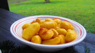 Изсипвам карамелизираните картофки в купичка, заедно със соса, образувал се по време на приготвянето им. Те са подходяща гарнитура към всяко месо.