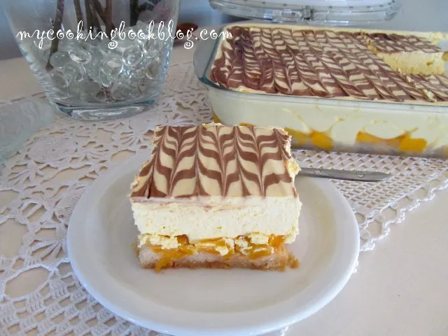 Десерт с бишкоти, компот от праскови и сметана