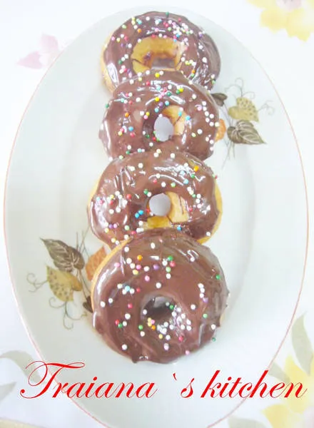 Докато поничките изстиват, разтопявам на водна баня един шоколад, слагам върху всяка и декорирам, с каквото имам под ръка
