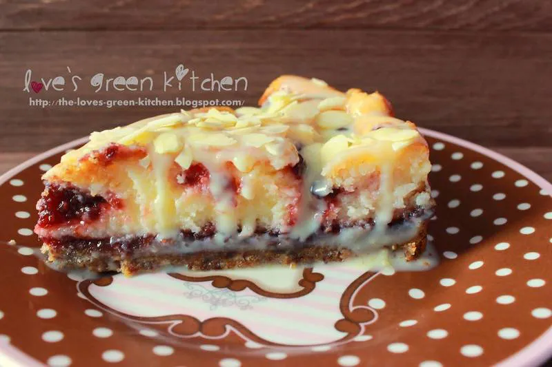 - Извадете тавата от хладилника и намажете със сладко от малини, разпределете сместа с крема сирене отгоре, загладете.