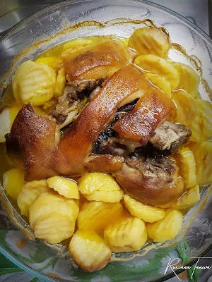 Бавно печен свински джолан с два вида моркови, лилави картофи и сушени сливи