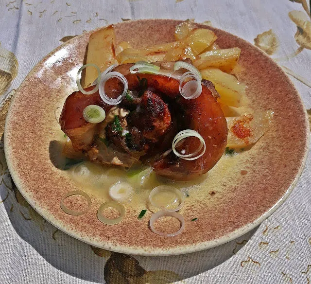 С получения сос поливам джоланите и украсявам с колелца от праз лук.