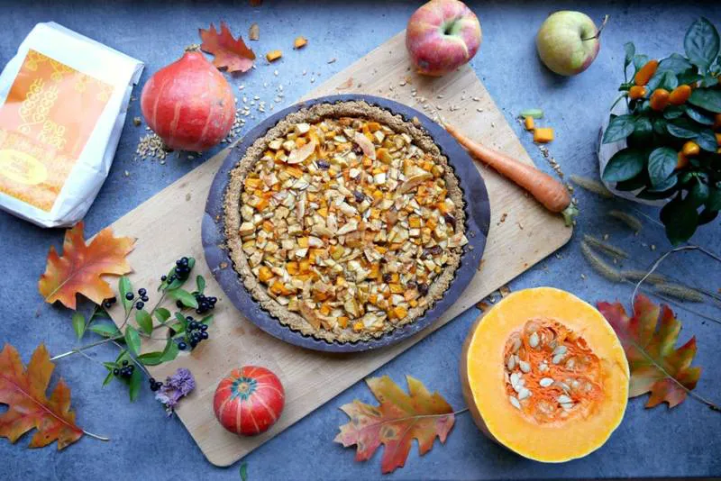 Поръсих готовия пай с 2-3 шепи кокосов чипс с морска сол, а в основата сложих цели зърна лимец, които просто предварително смлях с чопър. И двете неща бяха хит