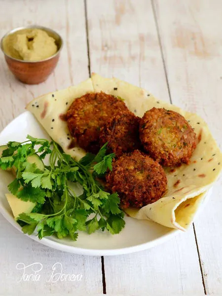 Сервирайте фалафелите с плоски питки и гарнирайте с хумус от леща и авокадо.