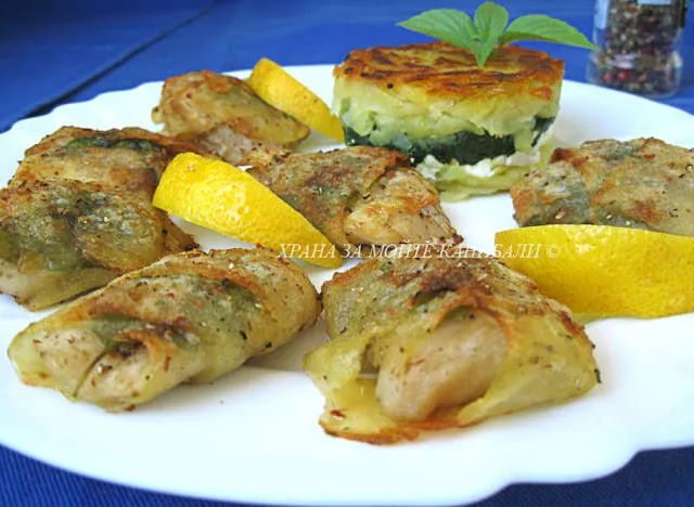 Филе от риба в картофена коричка и картофени рьощи със спанак