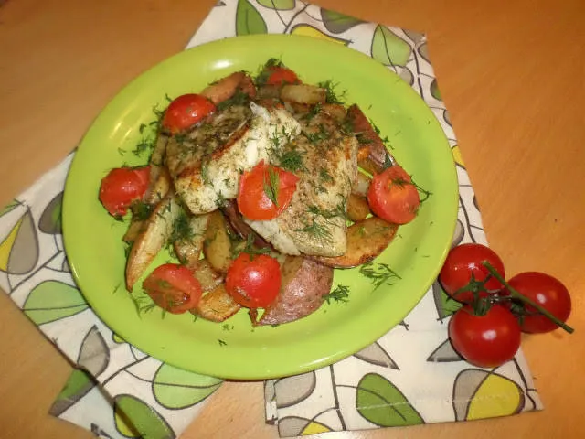 Сервирайте като сложите печени картофи в средата на чинията,отгоре по две парчета от рибата и част от доматчетата.Поръсете със ситно нарязан пресен копър