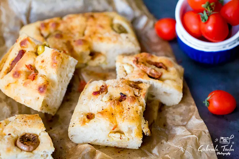 Фокача с квас, сушени домати и зелени гриловани маслини