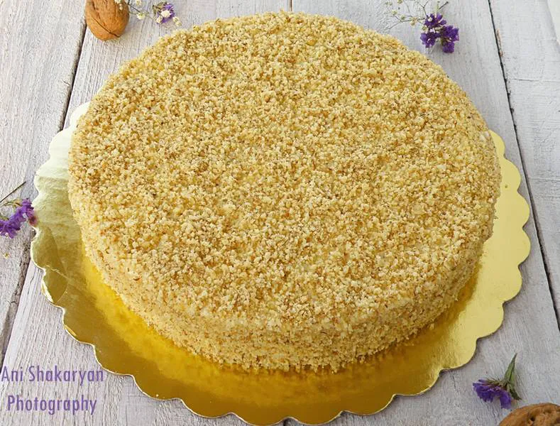Тортата е с олекотен крем, приготвен с цедено кисело мляко, вместо със заквасена сметана. С лимонов аромат и сладко от боровинки за по-богат вкус и медени блатове