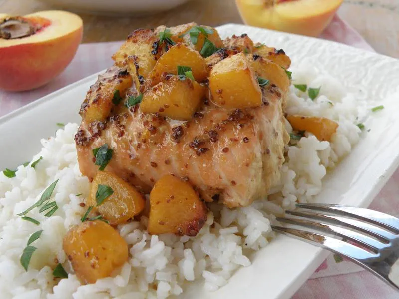 Прасковите придават нежност, аромат и приятна свежест на рибата, а глазурата мекота и лека сладост. Приготвя се изключително бързо.