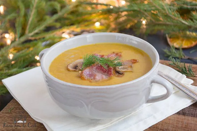 Гъбена крем супа с праз, моркови и бекон