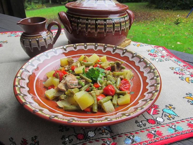 Това е ястие в което има от всички цветове и така се режат зеленчуците, че да радва окото като се сервира. Най-бавната част в приготвянето на гювеча е нарязването на цялото това разнообразие от зеленчуци. Другото задължително нещо е глинената тендежера