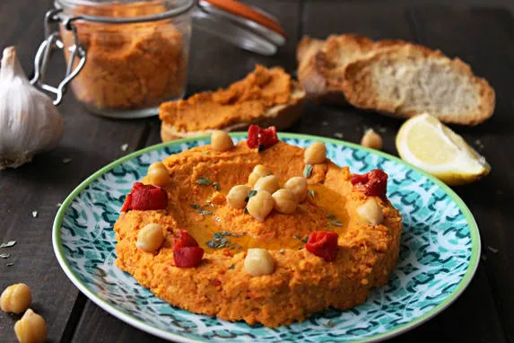 Идеята е към класически хумус да се добавят печени червени чушки. Вкусът и ароматът на печените чушки, определено много си пасват тук