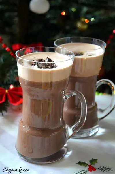 Сгряващ зимен коктейл. Напитката се разпределя в огнеупорни чаши, гарнира се с разбитата сметана и шоколада и се сервира веднага
