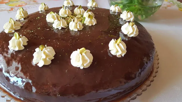 Турски шоколадов мокър кекс. За украса използвах шам фъстък и малки розички от бял ганаш с маскарпоне.