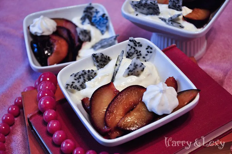 Йогурт десерт със сини сливи, целувки и черен сусам