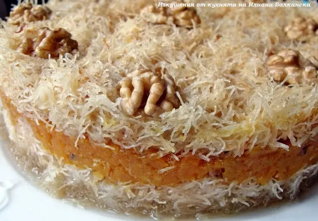 Торта от кадаиф и тиква или Тиквеник с кадаиф - вкусно! Украсява с цели орехови ядки