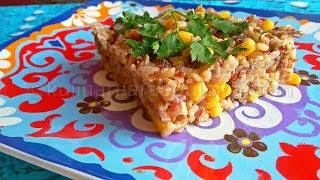 Кафяв и червен ориз с пилешко и царевица