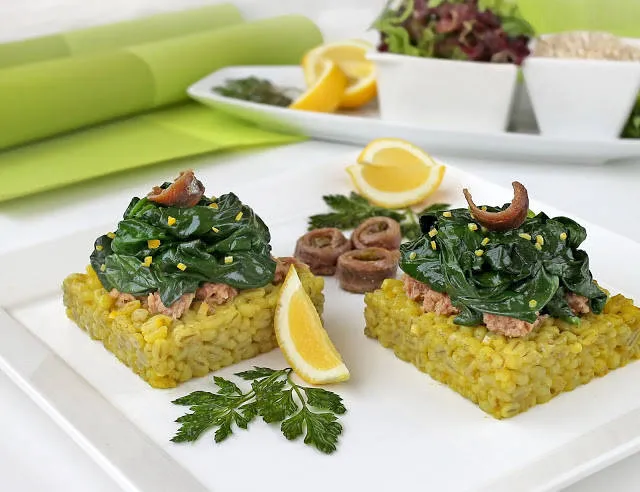 Италианска салата или предястие от перлен ечемик с шафран, гарниран със сотиран спанак, филета риба тон и аншоа